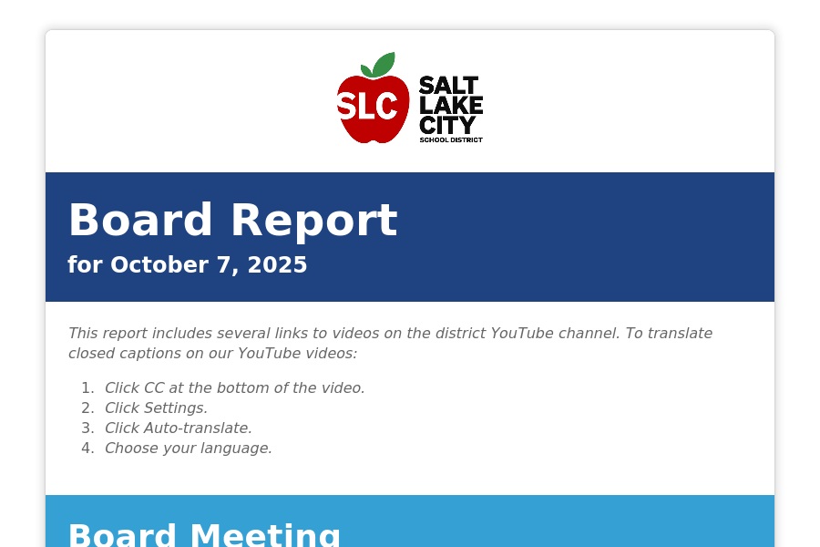 Board Report for October 7, 2025 This report includes several links to videos on the district YouTube channel. To translate closed captions on our YouTube videos: Click CC at . . .